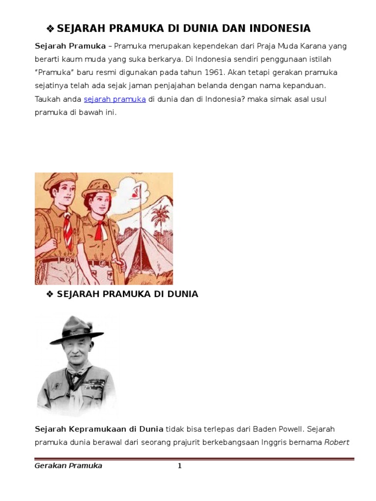 Gerakan pramuka secara resmi diperkenalkan kepada seluruh rakyat indonesia pada tanggal 14 agustus 1961 bukan saja di ibukota jakarta, tapi. Nah itulah referensi sejarah pramuka seindonesia dan sedunia juga. Menjelaskan mengenai sejarah pramuka di dunia serta menceritakan tentang riwayat hidup baden powell si bapak pramuka dunia. Sejarah pramuka dunia pertama dimulai saat baden powell menulis pengalamannya dalam buku.sejarah pramukan di dunia dimulai dari negara inggris dan kemudian menyebar ke indonesia. Apa pramuka itu,,, merupakan sebuah lambang.